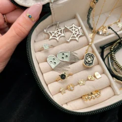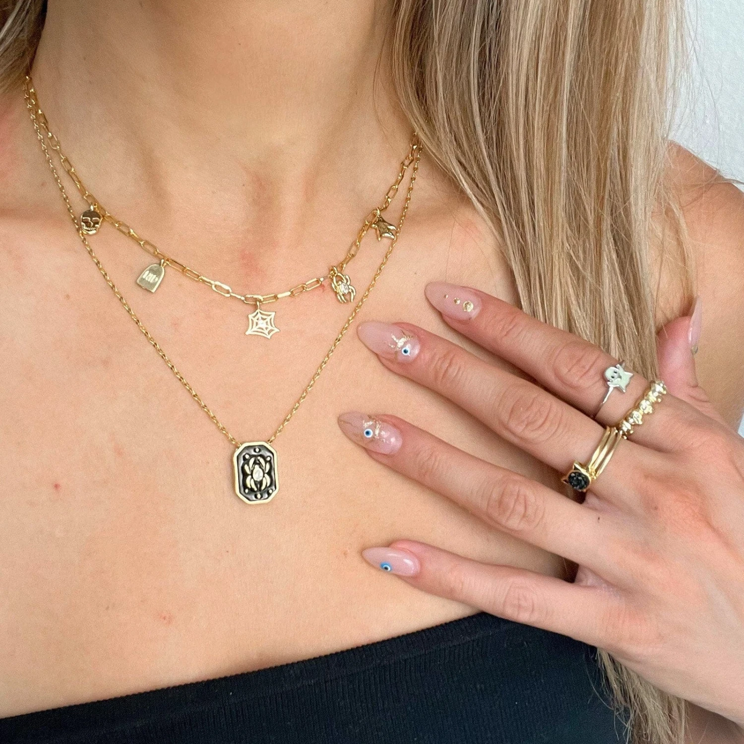 Spooky symbols suspended on a gold-plated, fancy mirror chain to finish off your Halloween look. The core of the spider is embellished with a clear Chinese glass stone, with the intricate chain laced through the top of the pendant. 18” in length with a 3” extension.