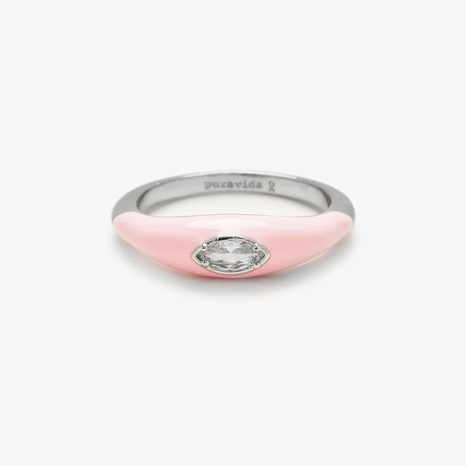 Shine bright and join the fight with our B4BC Marquise Enamel Ring. Set on a silver band and coated with pink enamel, this stunning style features a marquise-shaped stone that sparkles from any angle. For every ring sold, Pura Vida will donate 5% of the purchase price to Boarding for Breast Cancer, a nonprofit that advocates for early detection and a healthy, active lifestyle as the best means for preventing breast cancer, as well as providing support for Survivorship communities.