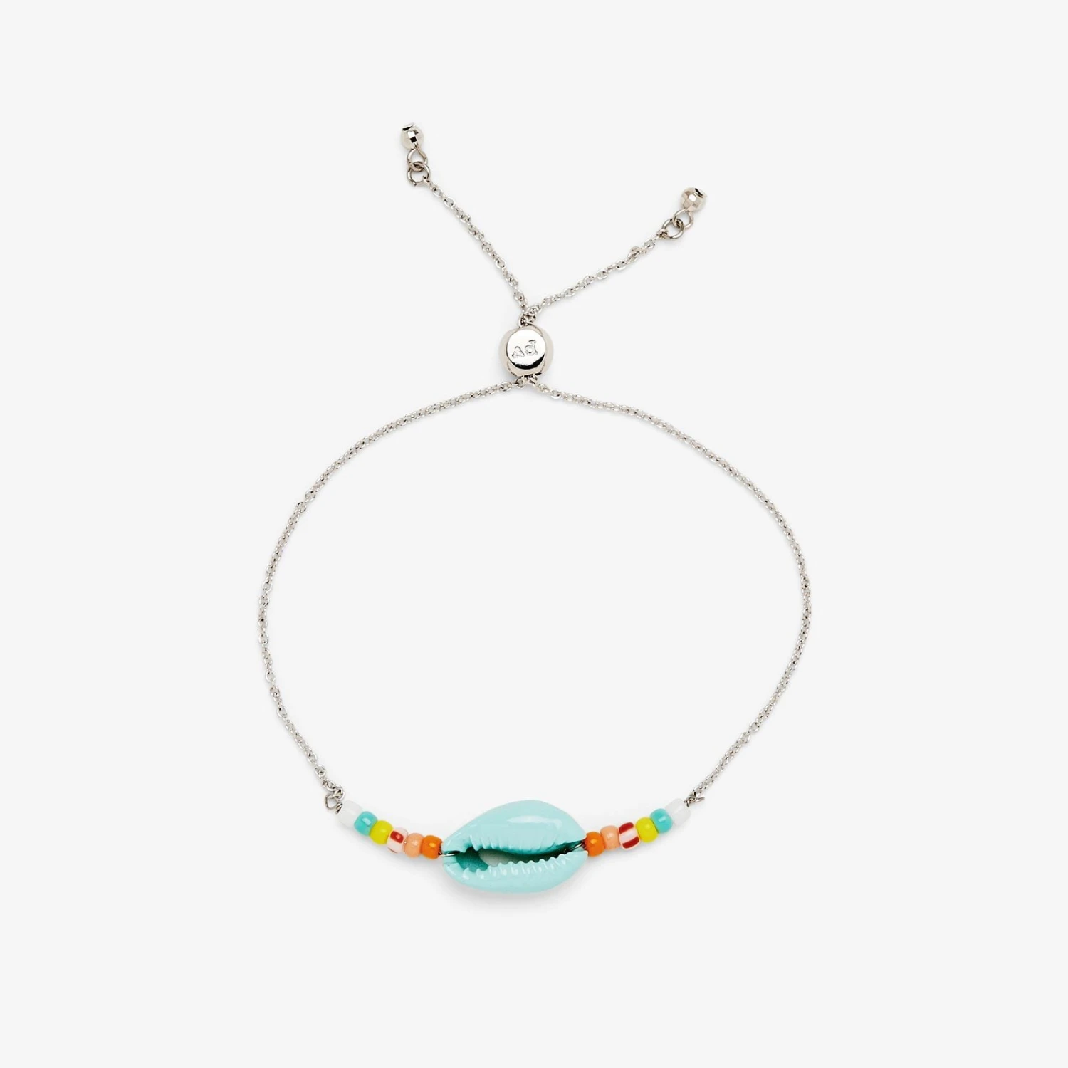 Turning your favorite candy colors into jewelry one Candy Coated Cowrie Slider Bracelet at a time! This silver bracelet features super cute colored beads plus a baby blue enamel cowrie shell that will bring extra good vibes this summer!