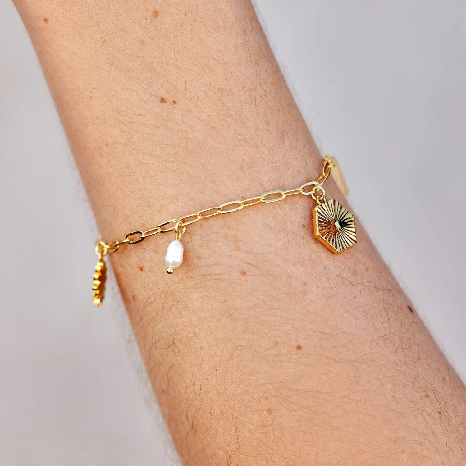 Shine like a golden goddess in our Fortune Charm Bracelet. This luxe open-link design features five gorgeous charms with elevated details like a natural quartz stone, a pretty pearl bead and intricate etching.