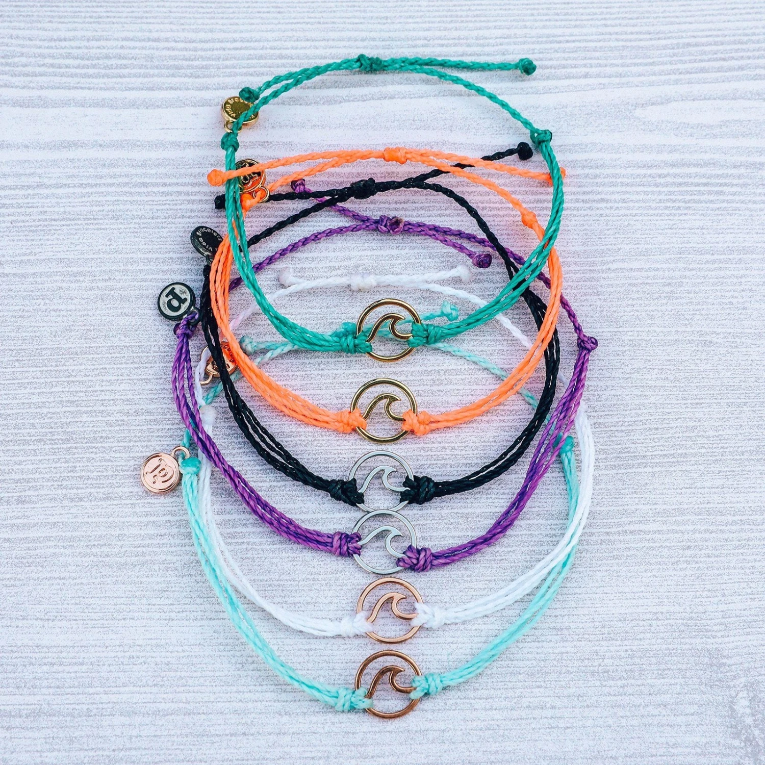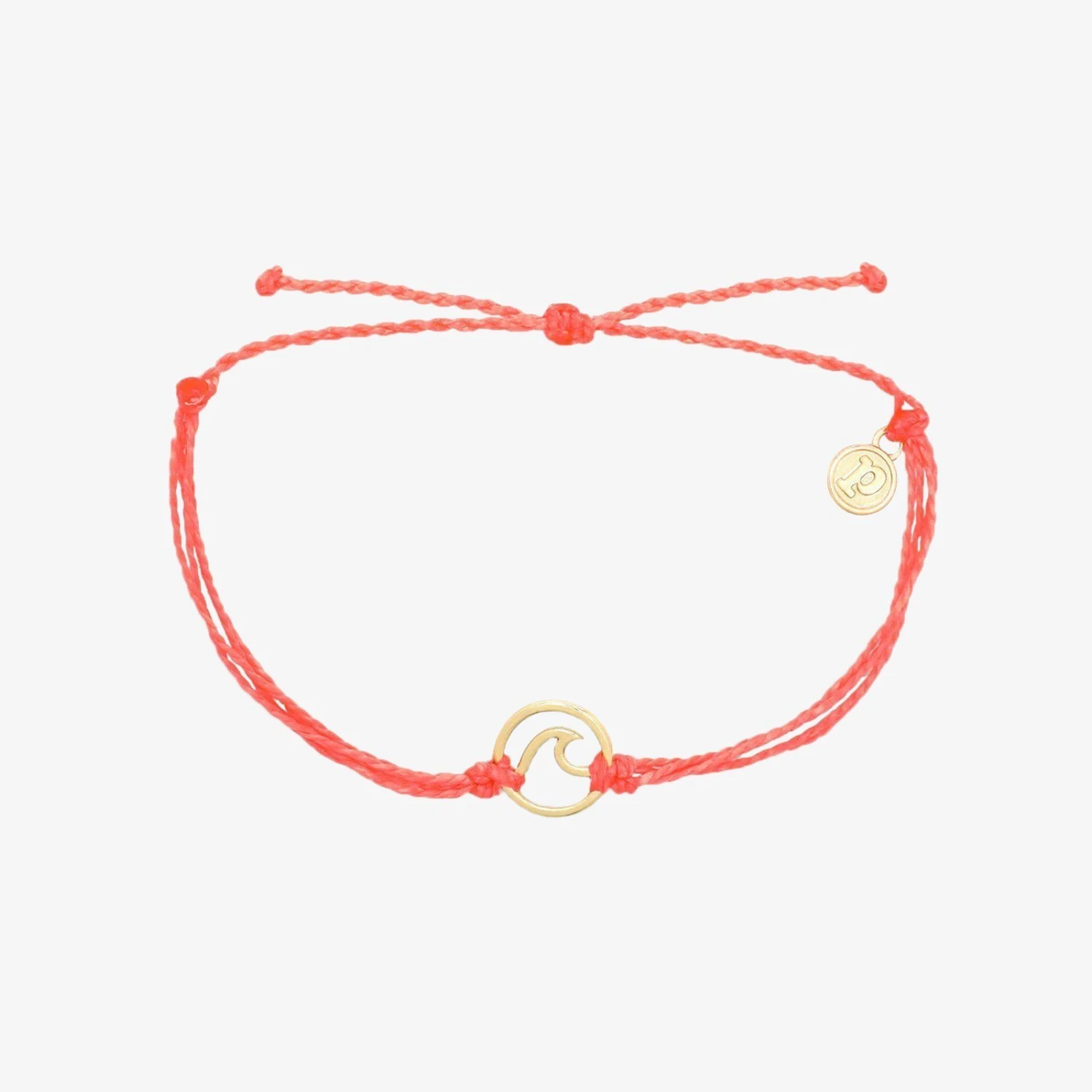 Ride the wave in style with our new Gold Wave Charms! This bracelet features three colored strings and a cutout wave charm that looks totally rad worn solo or in a stack.