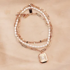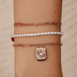 Add a little shine to any look with this trio of bracelets! The Heirloom Style Pack features 3 separate bracelets: a paperclip chain featuring a moonstone locket, a glass pearl bracelet, and a double-chain bracelet featuring a simple rope chain and a flat mirror chain.