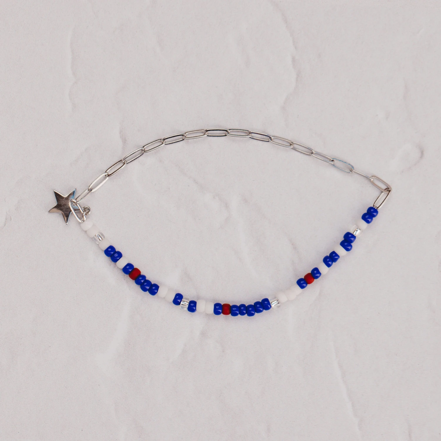 Oh, say can you see how cool the Home for Our Troops Stretch Bracelet is?! This charity style features an array of red, white and blue beads, plus paperclip chain detailing and a dangling star charm.