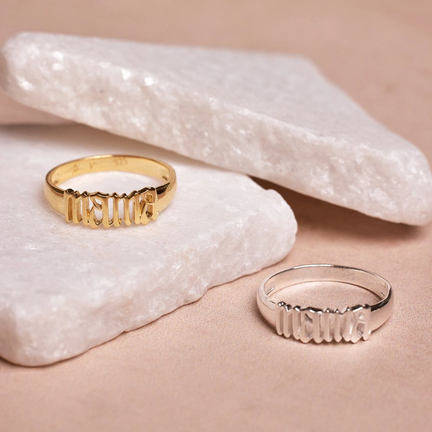 Rep your mom status or treat your favorite lady to something special with our Mama Demi-Fine Ring! Available in anti-tarnish sterling silver or 18k gold plating, this band ring is perfect for a mama to wear all day, everyday.