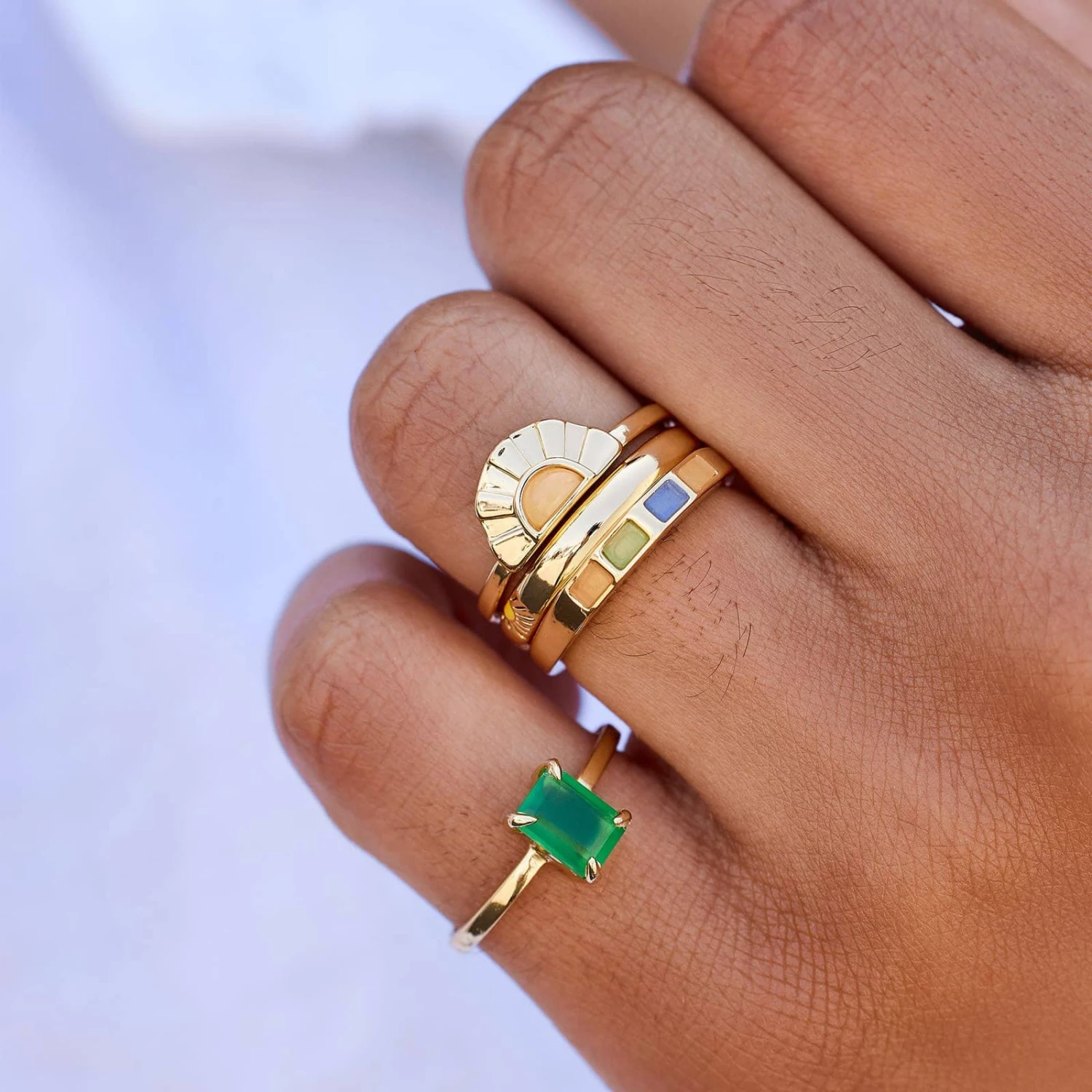 Golden like the first touch of coastal daylight. Solar silhouettes and a mingling of gemstones within the emerald, citrine, and kyanite inlay embodies the coastal California road trip feeling this collection was founded on.