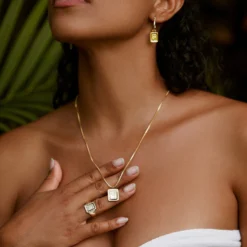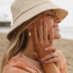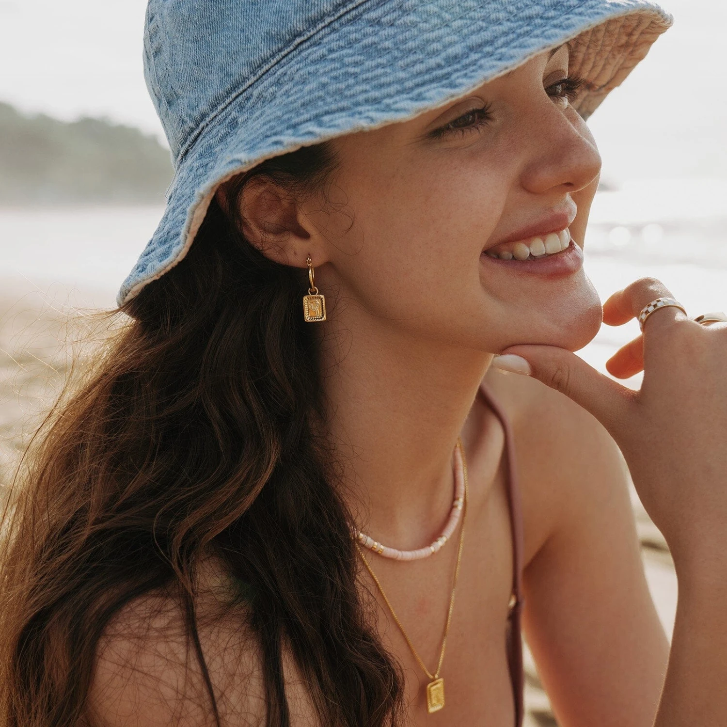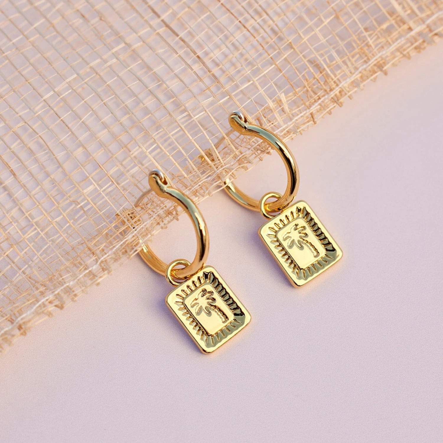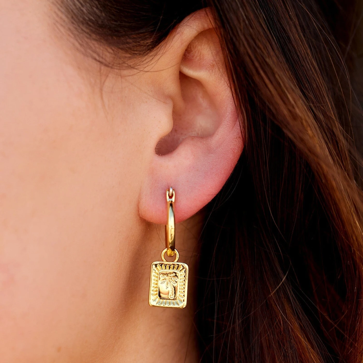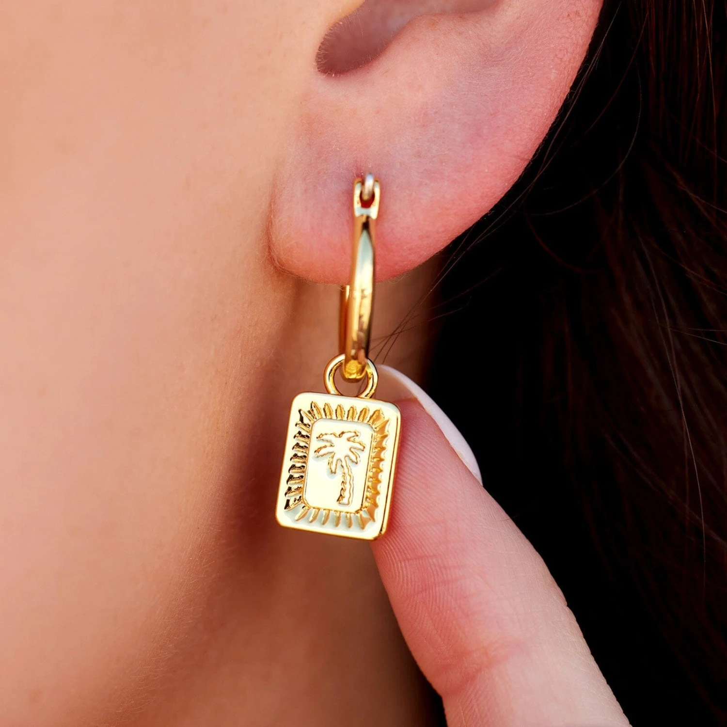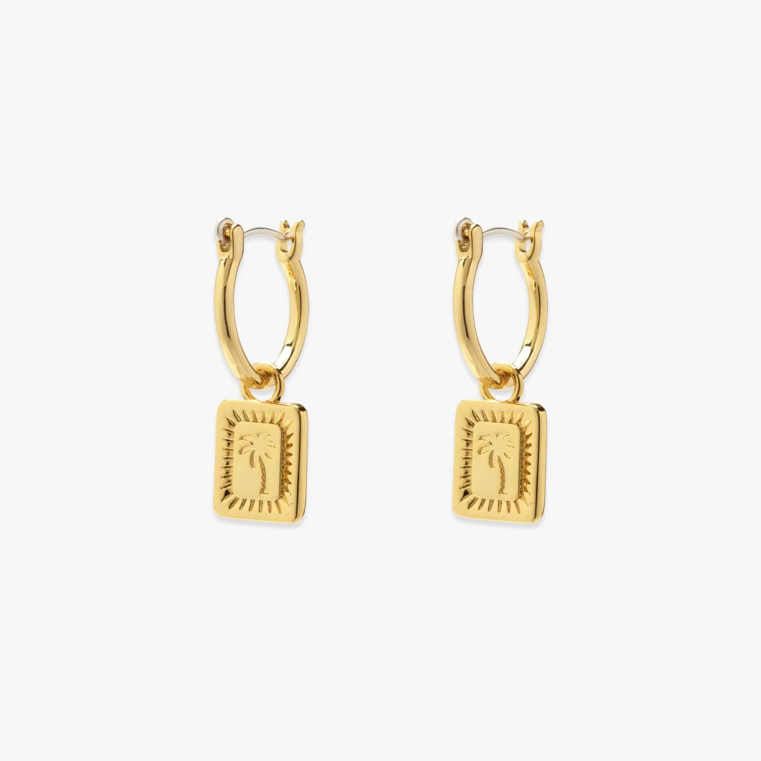 Be the best-dressed babe on the beach with our Palm Burst Huggies. This gorgeous gold pair features an itty bitty hoop with a dangling rectangular charm etched with a palm tree and sunburst detailing. Try it with our other Palm Burst pieces for even more seaside style.