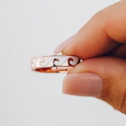 Our first ever reversible ring! Available in silver and rose gold with mother of pearl chips embedded in the enamel for a sparkling swell. Flip it upside down to match your mood or ‘fit.