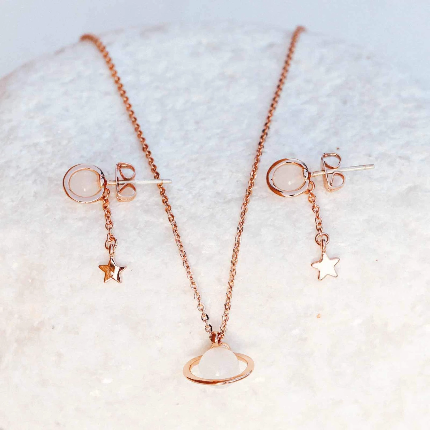 Calling everyone who’s space-obsessed: Our Saturn Necklace & Earring Set is the perfect pair for you! This insanely cute set features a pair of shimmering Saturn stud earrings with a dangling star charm, plus a matching rose gold Saturn charm necklace that’s lightyears beyond beautiful.