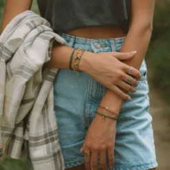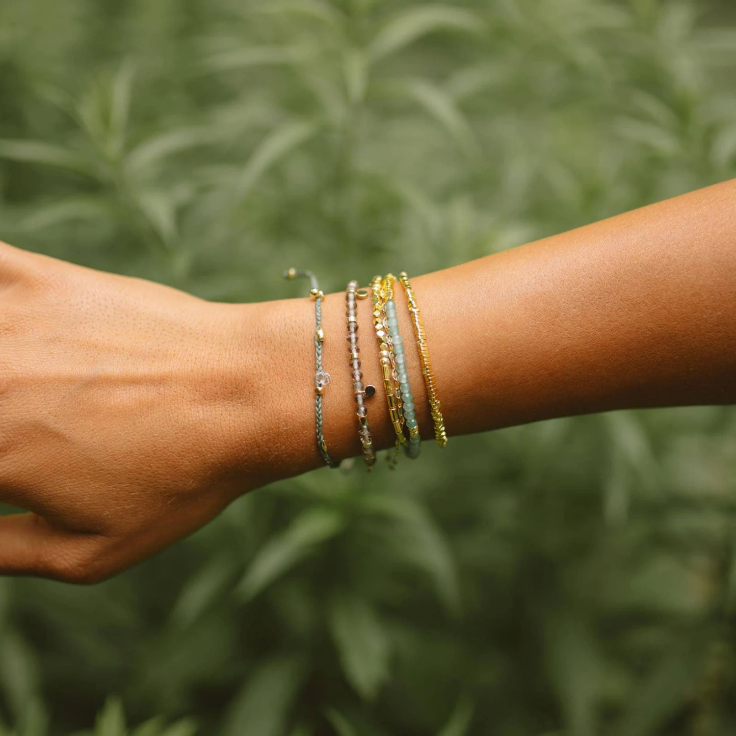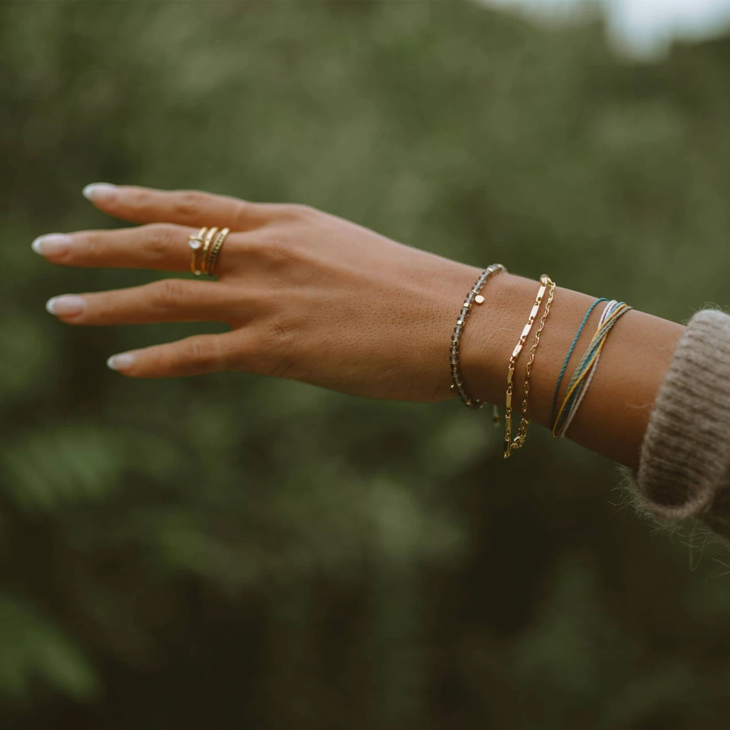An unconventional approach to neutral nautical with elements like braided string, smokey quartz, and brass accents creating a unique, dusk-like colorway. Also available in as a choker style.