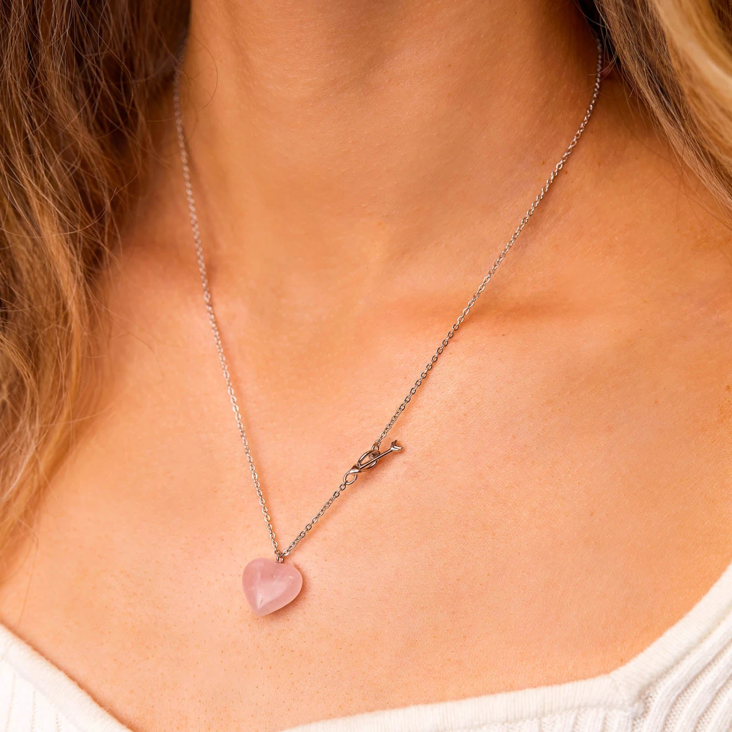 Get swept off your feet by the Stone Heart Toggle Necklace. This super sweet silver style features a delicate chain and genuine rose quartz heart charm to promote love and compassion. Plus, it features a little Cupid’s arrow toggle closure to make it even cuter!