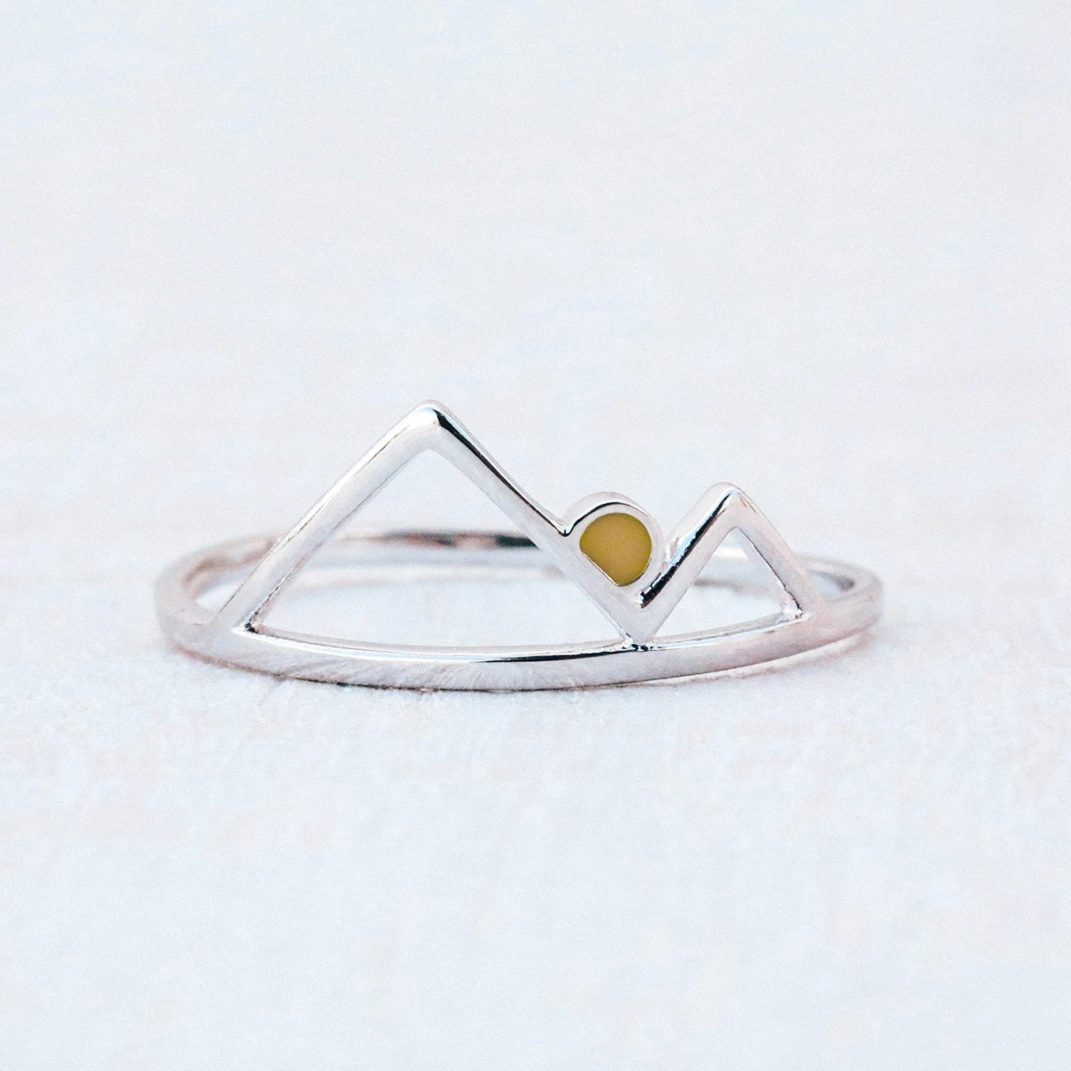 Our Sunrise Ring is the peak of perfection. This stackable style features an enamel sun rising over a cutout mountain design with a silver hammered band. Match it back to the Sunrise Bracelet for the ultimate outdoor look.